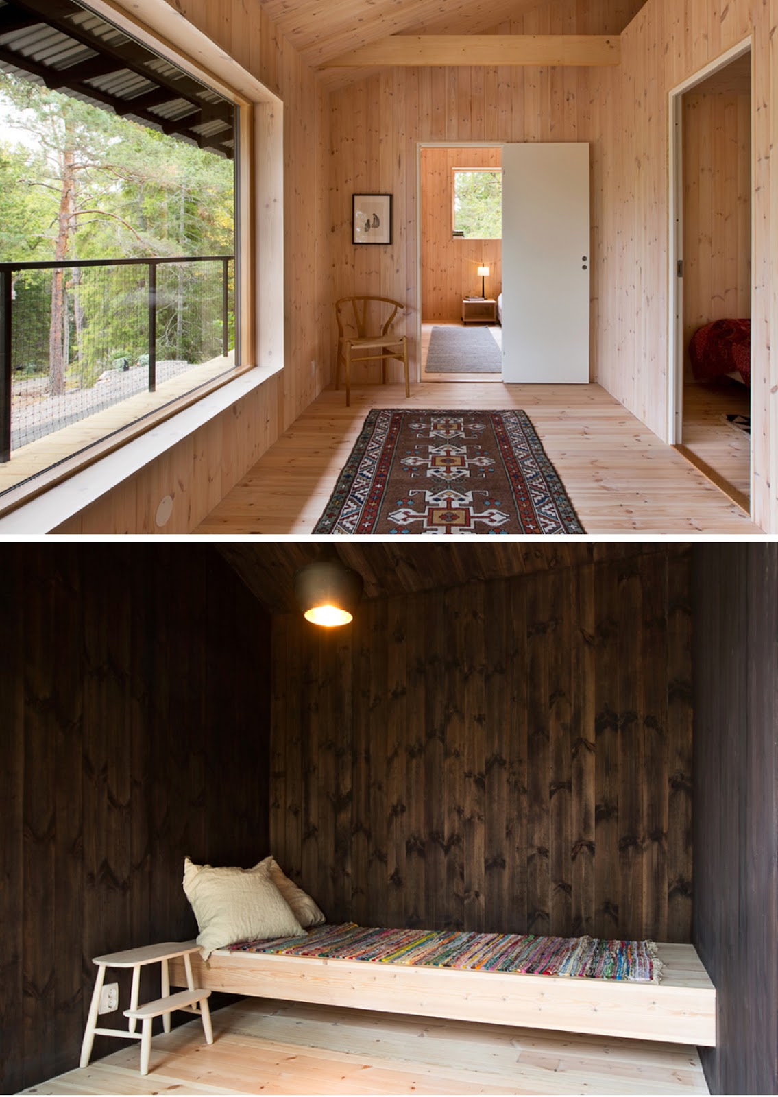 Si no me equivoco esta madera es abedul o betula como se conoce en español, y por acá en Noruega se le conoce como bjørk. Generalmente las superficies llenas de madera me disgustan, pero precisamente eso es lo que me gusta del interiorismo, que no existen los definitivos, puedes decir no me gusta todo de madera, y de repente te topas con algo como esto, y piensas.. ok no me gusta pero en esta ocasión está muy bonito! Bueno, esto me pasó al ver esta cabaña. Me llama mucho la atención la forma minimalista de vivir, con pocas posesiones o al menos escondidas, me siento tranquila y me trae mucha paz. No sé si usaría el sauna al aire libre, por acá es verano pero estamos todavía a 10 grados centígrados...